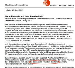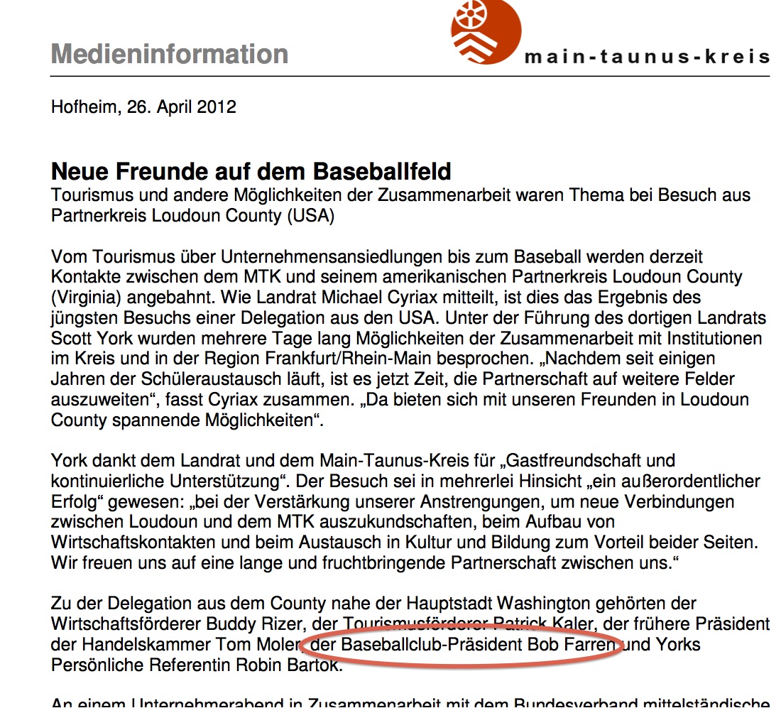 Die Press Release from Loudoun’s “sister county’ Main-Taunus-Kreis reporting the exciting visit of the Loudoun delegation, including Der Baseballclub-Führer Bob Farren