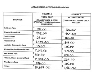 I finally got hold of the actual contract awarded to Blake Landscapes, which finished the spraying last week. The good news is that instead of flushing $20,000 of your tax dollars down the drain, the county got a great bargain and flushed only $10,359 down the drain.