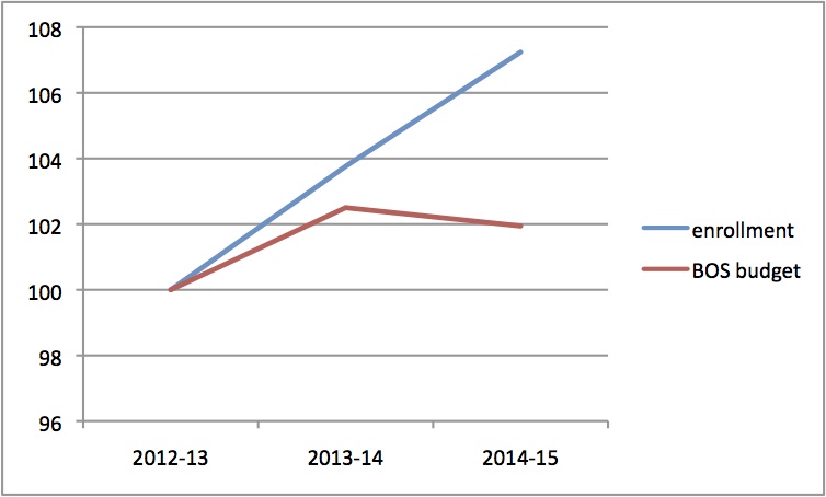 Here’s what your all-Republican Supervisors in fact have done the last couple of years, and are planning to do next year — this graph compares enrollment growth to the approved budget our fearless leaders dictated, on an index of 100 for the 2012–13 school year: